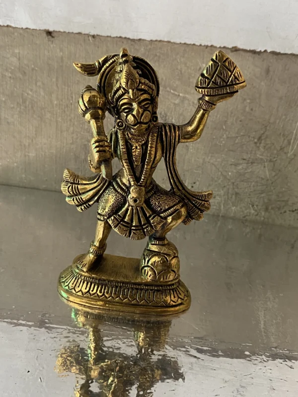 Celebrate the devotion and might of Lord Hanuman with this Brass Hanuman with Sanjeevani Parvat Idol. This powerful sculpture depicts Hanuman carrying the Sanjeevani mountain, a symbol of his strength and unwavering dedication. Crafted from premium brass, the idol is meticulously detailed, highlighting Hanuman’s muscular form and the textured surface of the mountain.